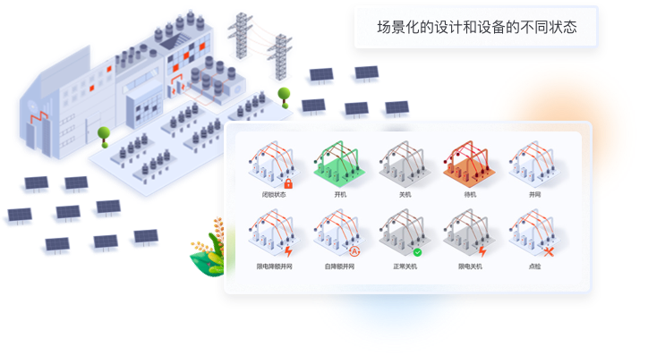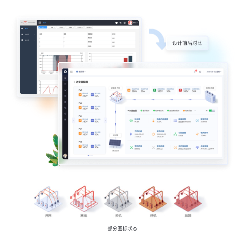 针对数据信息发生的变化,我们使用“场景化设计原则“,用立体图标方式绘制出从”光伏板-逆变器-交流汇流箱“发电原理图,把数据展示在对应的环节中,形成可视化的实时监控图谱。;其余与发电流程无关的数据也均以图标+文字的形式展示页页面右侧。