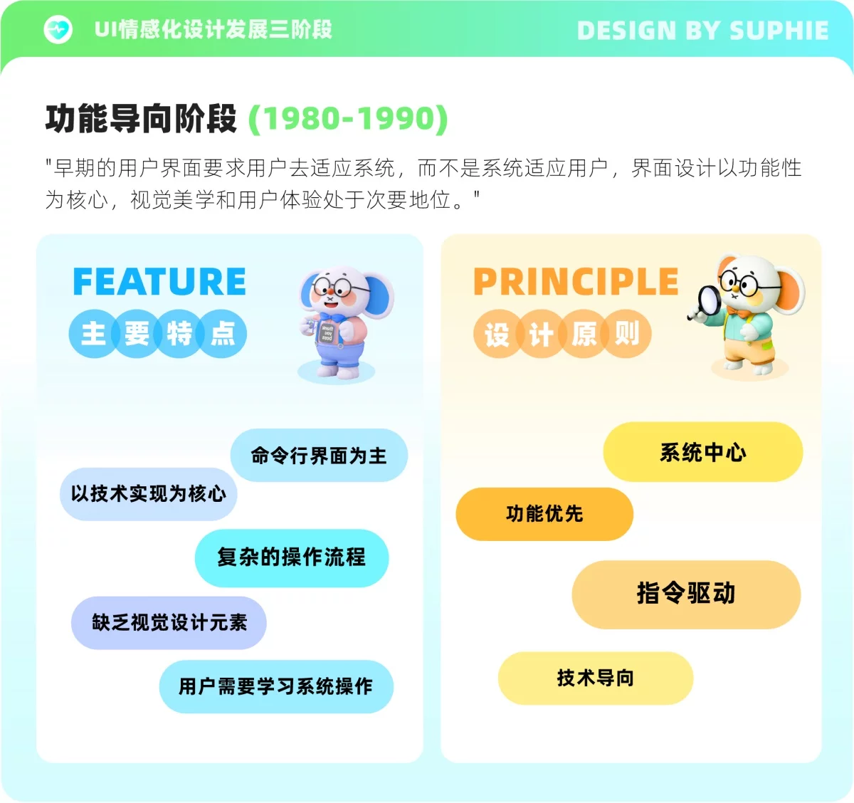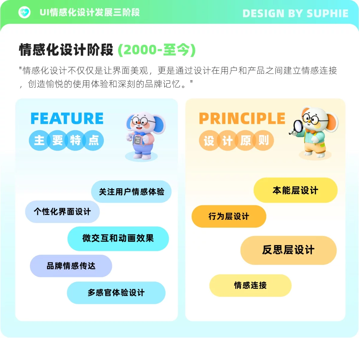 - 原则是设计的基础,并非一成不变,需要结合设计原则与产品目标之间的关系进行合理运用;