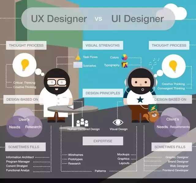 总结:UI设计是展现视觉层面的(界面),而UX是使用过程中的情感(互动与体验)。UX设计师不仅关注界面的设计,更关心所有会影响使用者体验的一切。如架构、互动、内容与及使用者对象、需求、价值观。