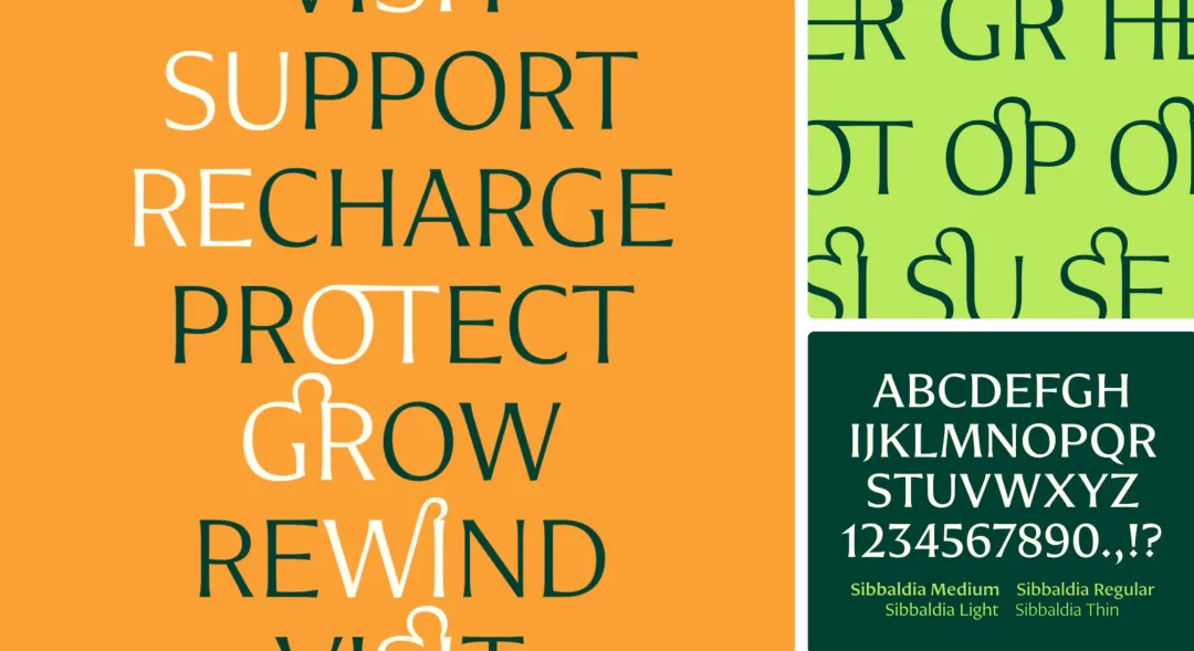 这些标志首次展示了一款全新的定制字体,共有四种字重。它是Nomada Incise的定制版,线条棱角分明,优雅别致。最细的字重中包含一系列连字,呼应了西巴尔迪亚符号及其边框的生动呈现。