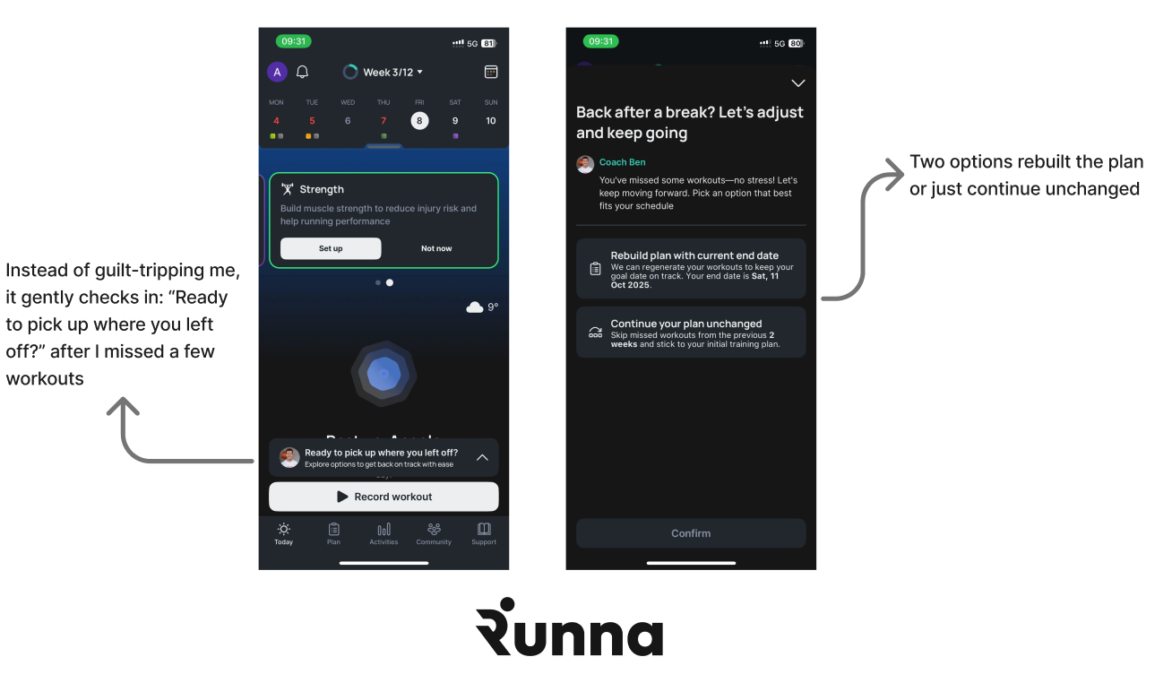 Runna 看到了其中的差距。一款从用户情境出发,运用实时数据,像真正的教练一样灵活调整,并且使用体验良好的产品?这真是开创性的……主要是因为之前没人费心去做。