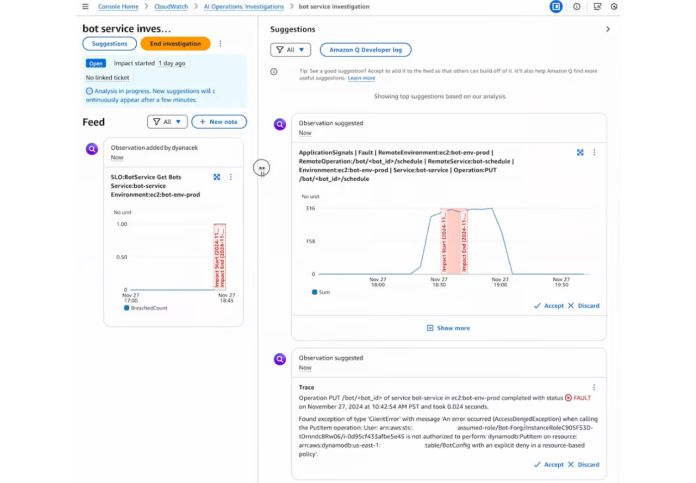 现在,工作代理返回了一些“建议的观察结果”,这些结果由主管处理并添加到屏幕右侧的建议中。请注意,屏幕右侧现在更宽了,以便于阅读代理建议。在下面的屏幕中,不同的代理提出了两个截然不同的观察结果,第一个代理专门负责服务指标,第二个代理专门负责跟踪。