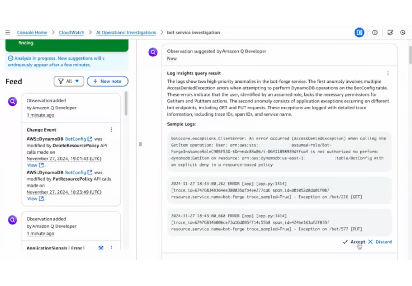 人工操作员会点击“接受”按钮,确认他们认为相关的观察结果,这些结果会被添加到屏幕左侧的调查“案例档案”中。现在,人工操作员已经添加了反馈,表明他们认为这些信息是相关的,代理流程将启动调查的下一阶段。主管代理收到用户反馈后,将不再发送“更多相同的信息”,而是会进行更深入的挖掘,甚至可能调查系统的其他方面,以寻找根本原因。请注意,下图中右侧出现的新建议属于另一种类型——它们现在正在查看日志以寻找根本原因。