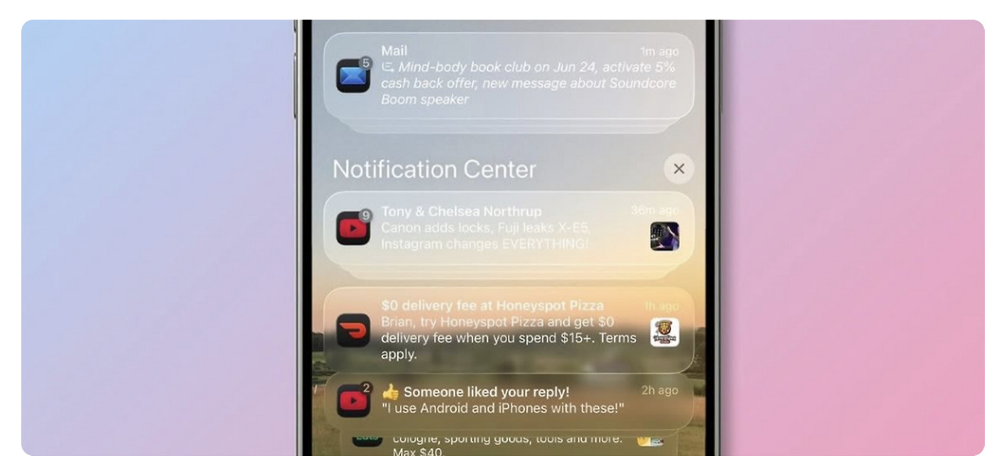 比如看邮件时,如果邮件内容是纯文字,玻璃背景会尽量 “隐身”,只保留淡淡的分层;如果邮件里有表格或图片,背景会自动加强模糊,让表格的边框更清晰;就连收到推送时,通知栏的玻璃界面会比背景亮一点,既能提醒我 “有新消息”,又不会像扁平时代的弹窗那样 “挡视线”。