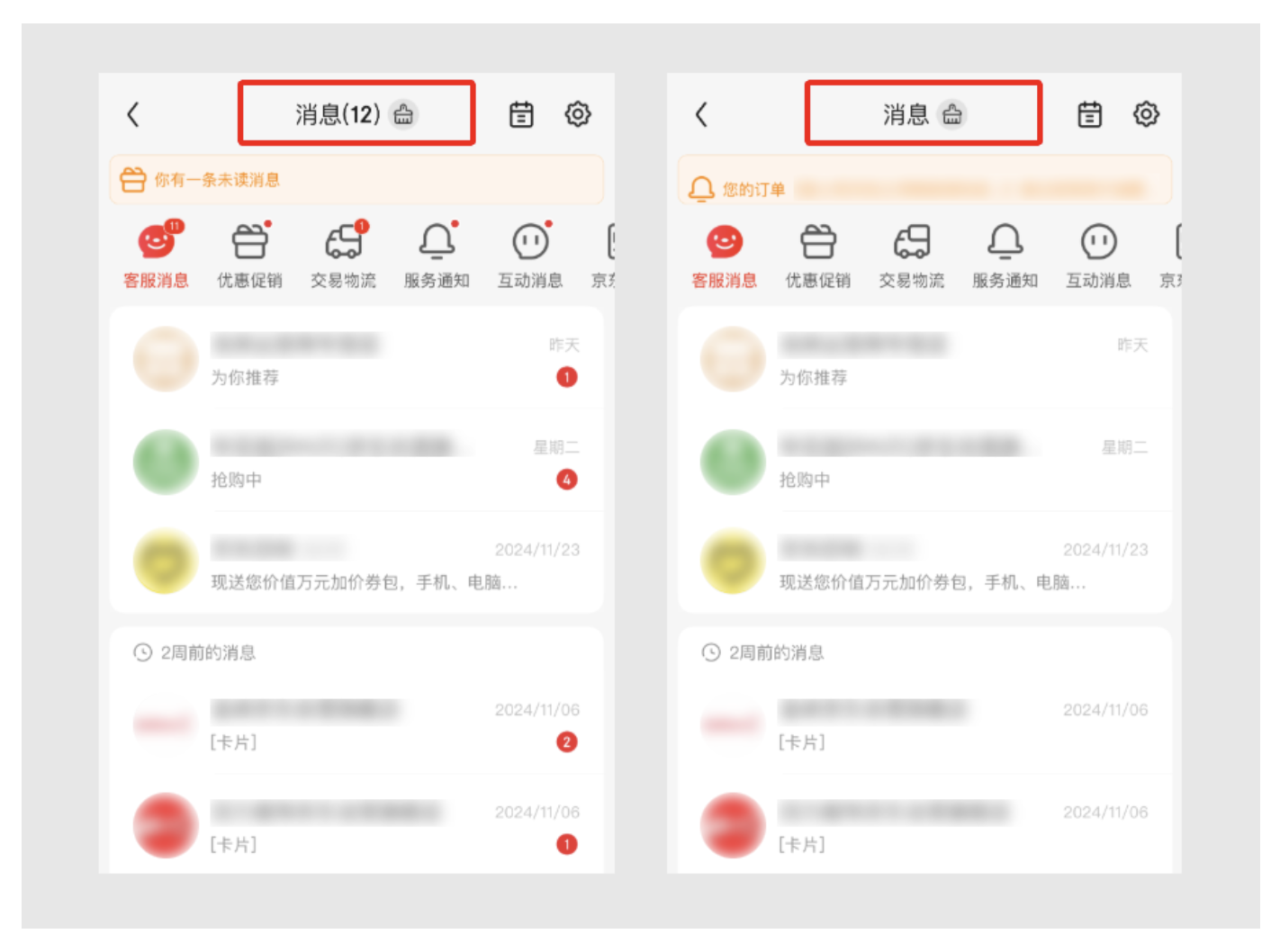 拼多多、京东、美团这类 APP,未读消息大多是促销、物流、商家群发,即时性强但 “长期价值低”。比如拼多多的 “拼单成功通知”、美团的 “优惠券过期提醒”,用户看完一次就没用了,攒多了只会占地方。