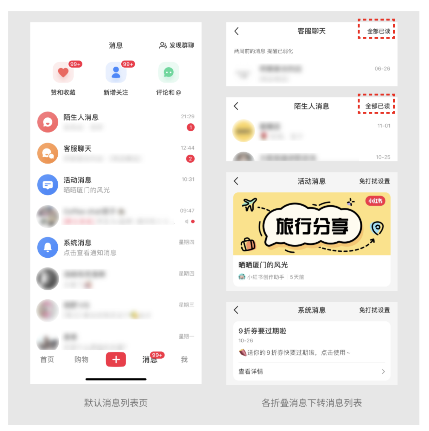 在所有 APP 里,小红书的 “一键已读” 最细腻 —— 它没做 “全局一键清”,而是分场景设计,把 “该留的消息” 和 “该清的消息” 分得明明白白。