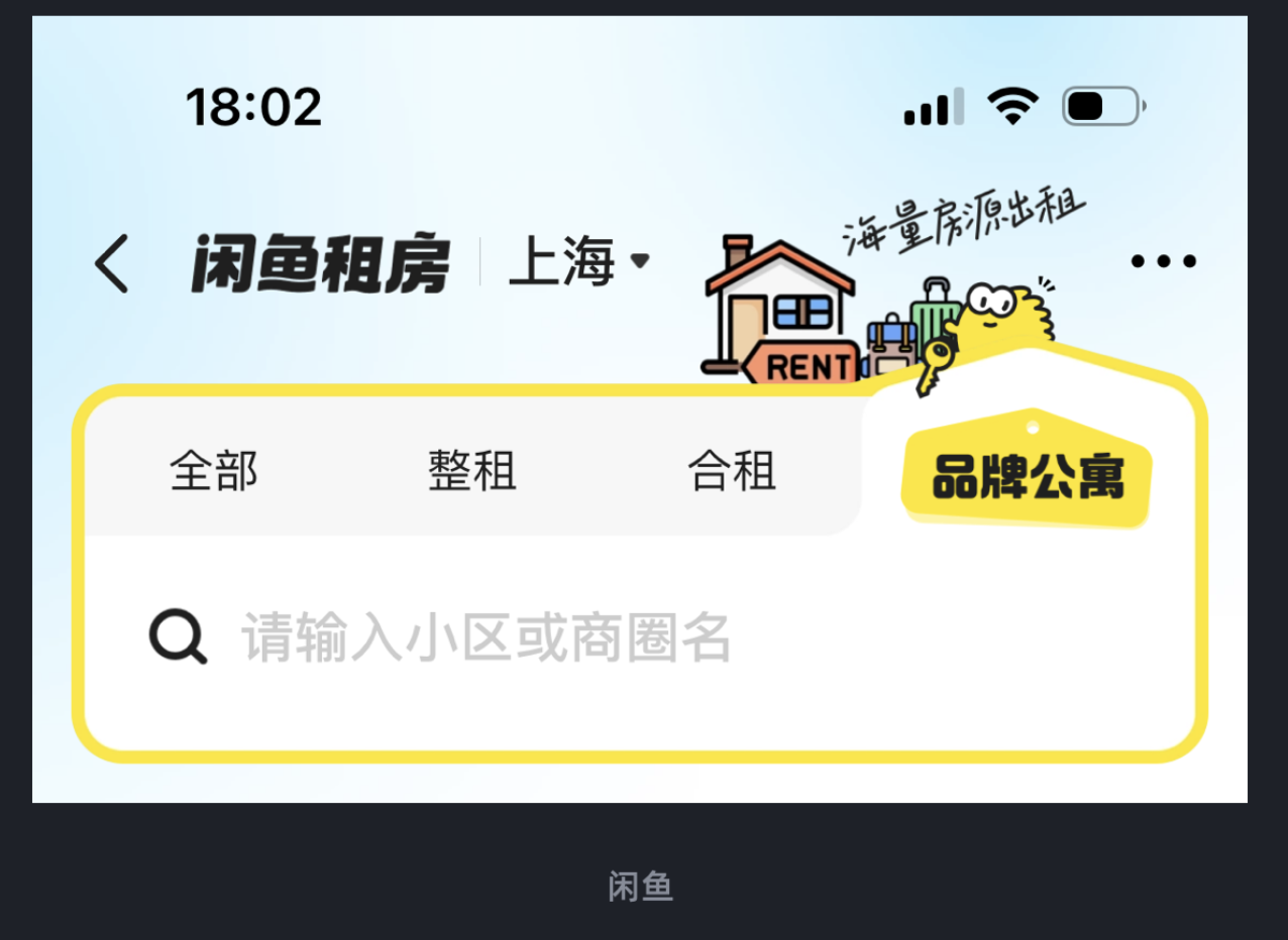 传统租房板块多以 “文字 + 普通卡片” 呈现,用户需先读文字才能识别功能;闲鱼则直接将 “房屋结构” 转化为视觉符号 —— 卡片上用简化的房屋轮廓图标替代传统标签,配合 “RENT” 英文标识,让用户一眼就能关联 “租房” 业务。这种设计不仅强化了业务属性,还通过图形化降低了信息识别成本,同时独特的视觉符号也加深了用户对产品的记忆度。