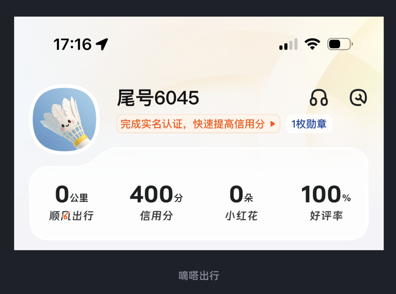 不同于传统的圆形或方形头像,嘀嗒采用 “超椭圆头像”,并将其与个人信息卡片的左上角凹陷处精准匹配 —— 头像的边缘与卡片凹陷完美贴合,仿佛 “嵌” 在卡片里。这种设计既突出了头像这个核心元素,又避免了传统布局中头像与卡片之间的负空间浪费,让整体结构更紧凑饱满。同时,卡片内信用分、小红花、好评率等信息围绕头像有序排布,视觉流自然且不杂乱。