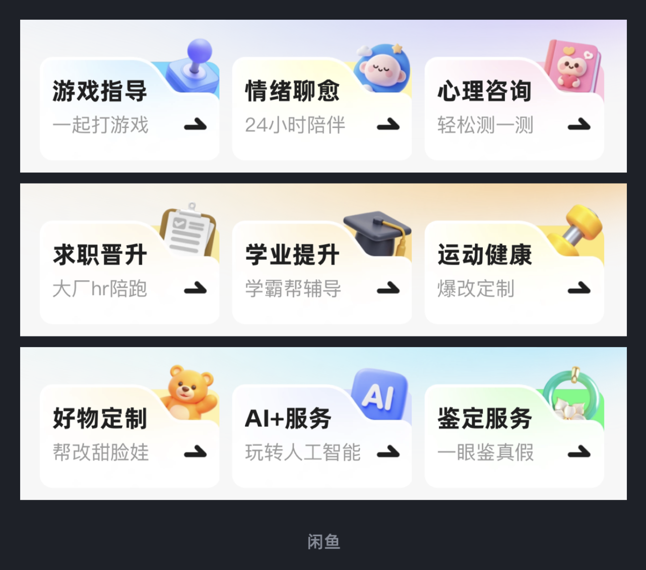 闲鱼的副业模块(如游戏指导、情绪聊愈、心理咨询)采用 “异形卡片” 设计:每张卡片的右上角都做了凹陷处理,将功能图标嵌入凹陷处,形成 “卡片 - 图标” 的第一层关联;同时,每张异形卡片下方又叠加了一层浅色调的背景卡片,通过色彩深浅和轮廓差异,形成 “背景卡片 - 异形卡片 - 图标” 的三层结构。这种设计不仅让每个副业模块的边界更清晰,还通过 Z 轴层级的差异,避免了多模块排列的呆板感,用户能快速识别不同功能。