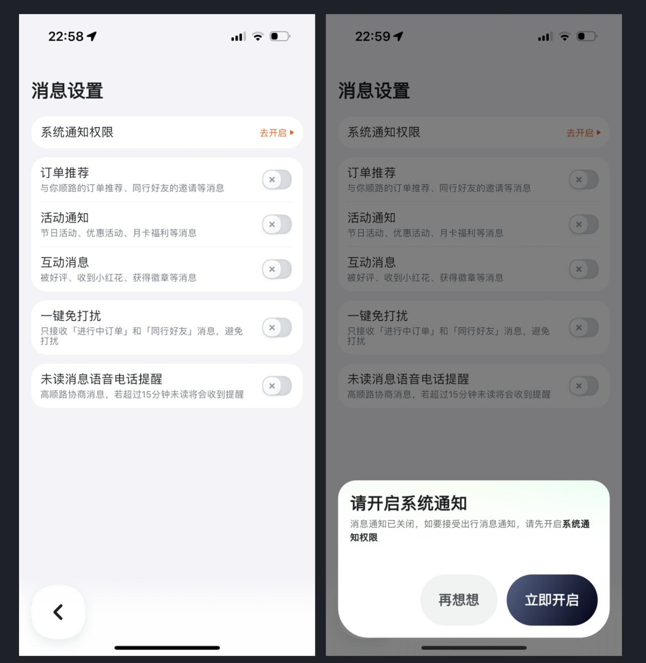 “引导用户开启系统通知” 是很多 APP 的刚需,但传统设计多采用 “强硬引导”(如 “去开启” 按钮),忽略了用户 “怕打扰” 的核心顾虑,反而导致用户反感。嘀嗒出行的通知设置设计,却用 “一键免打扰” 的选项,做到了 “产品需求” 与 “用户体验” 的平衡。