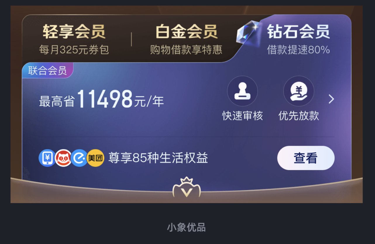 小象优品的会员卡片采用 “异形结构”—— 不同等级的卡片(轻享会员、白金会员、钻石会员)有不同的轮廓弧度,边缘处加入了细腻的光影渐变(如钻石会员卡片边缘有更强的光泽感),配合卡片内部的渐变背景,形成 “卡片 - 光影 - 背景” 的三层质感。这种设计不仅让不同等级的会员卡片一眼可辨,还通过精致的光影细节,让卡片从 “平面图形” 变成 “有质感的实体”,间接传递 “会员身份尊贵” 的心理暗示。