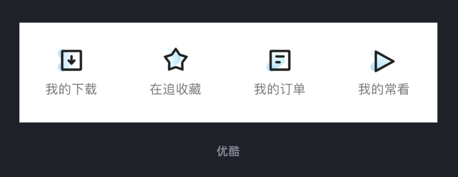 比如优酷个人中心的图标 ——“我的下载”“我的订单” 这些功能按钮,都采用简洁的线性风格,但在图标的底层悄悄叠加了优酷的品牌图形元素。这种 “线性 + 品牌点缀” 的设计,既保持了界面的清爽感,又让图标跳出了 “千篇一律” 的困境,用户看到图标时,会下意识联想到 “这是优酷的设计”,慢慢形成记忆点。
