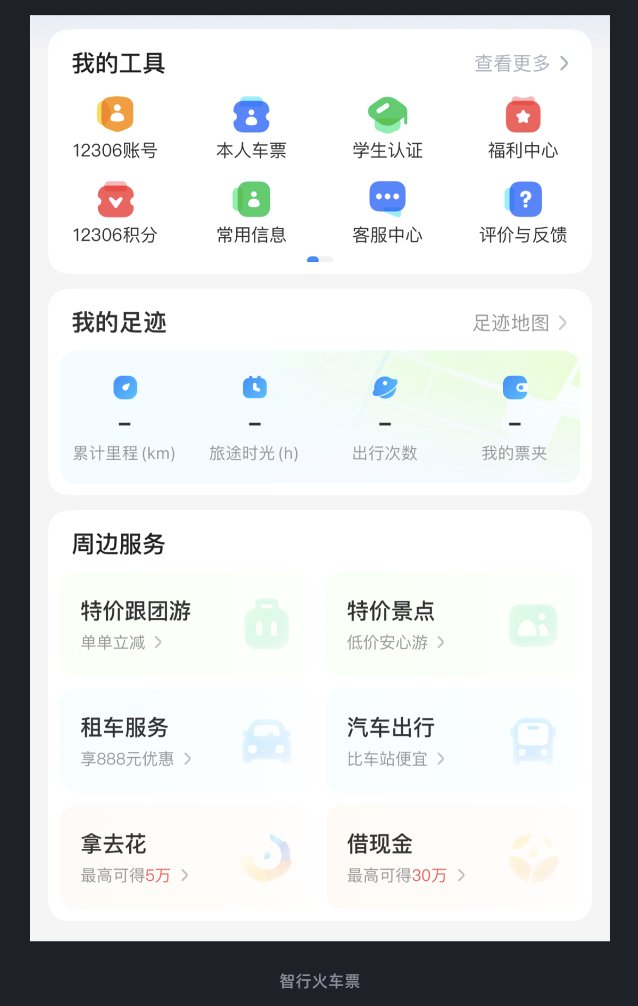 在智行火车票的个人中心里,有 “我的工具”“常用信息”“周边服务” 三个主要版块。其中 “我的工具”(12306 账号、本人车票、学生认证等)和 “常用信息”(我的足迹、我的票夹等)是用户高频使用的功能,所以这两个版块的图标用了 “高饱和度、低明度” 的配色,视觉张力强,能第一时间吸引用户的注意力;而 “周边服务”(特价跟团游、租车服务、拿去花等)是辅助功能,图标就采用了 “高明度、低饱和度” 的处理方式,颜色更浅、更柔和,视觉上故意 “弱化”。