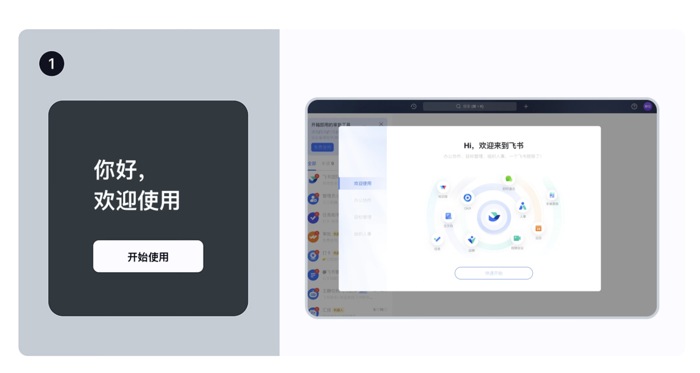 - 例子:飞书的欢迎页会直接告诉用户 “这里有办公协作、云文档、审批等功能”,既点明核心价值,又定下专业的办公氛围;