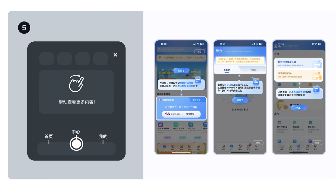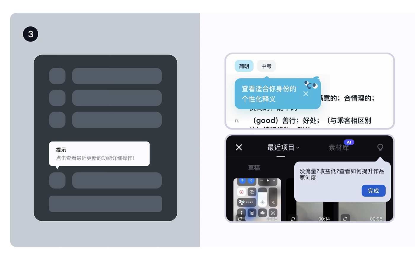 - 例子:税务 APP 新增 “待办功能” 后,会在 “待办” 入口旁弹气泡,告诉用户 “这里能处理未办结事项”,用户点 “知道了” 就关闭,不影响正常使用;