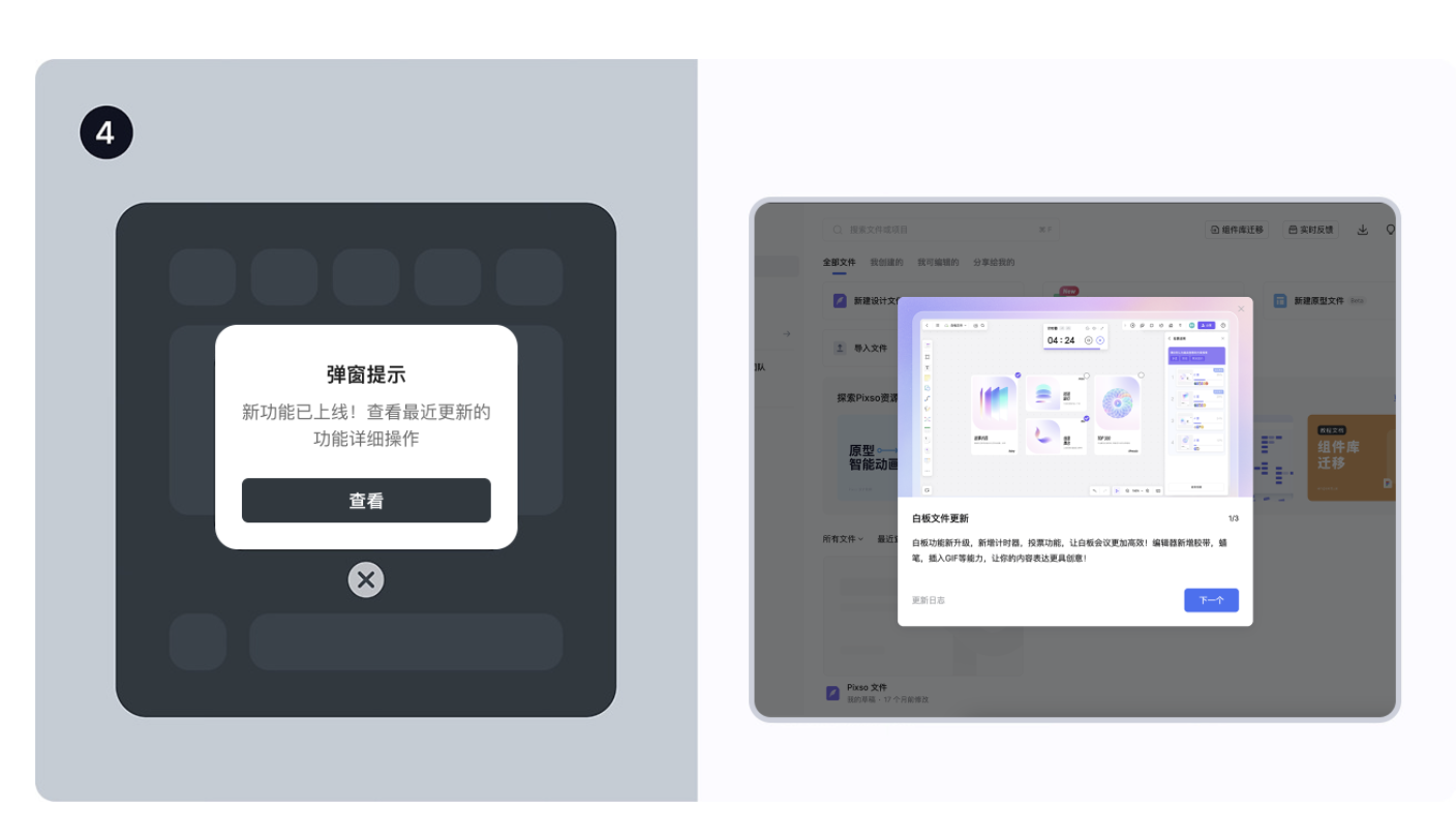 - 例子:Pixso 更新白板功能后,用弹窗提示 “新增计时器、投票功能”,用户看完能直接点 “查看” 或 “关闭”;