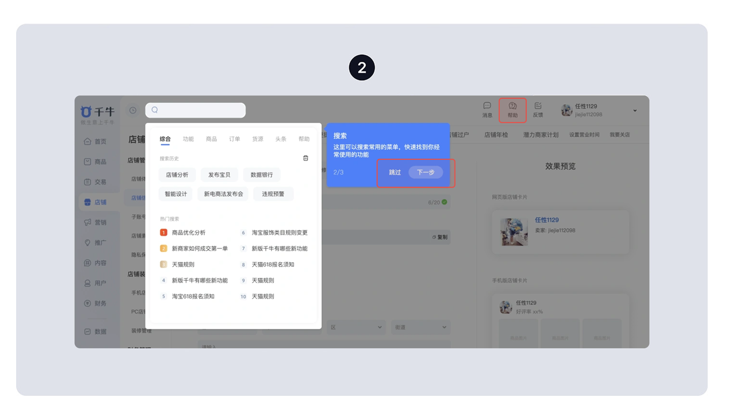 - 例子:千牛 APP 的新手引导会提示 “这里能搜索常用功能”,用户可以点 “下一步” 继续看,也能直接点 “跳过”;Notion 没有强制引导,而是单独做了 “帮助页面”,用户有问题再去查;