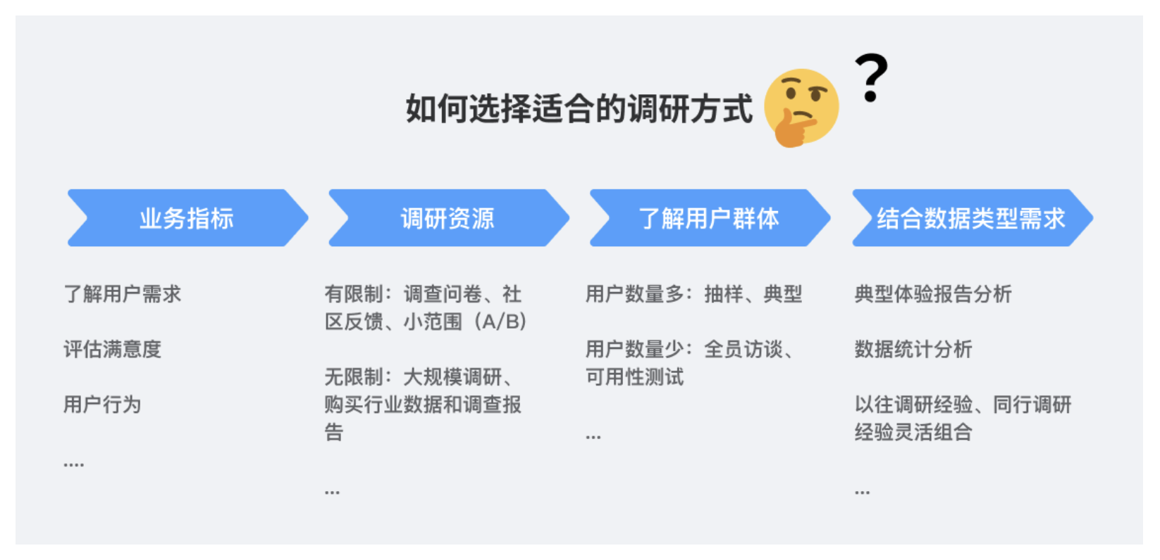 难点在于 “资源有限”—— 不可能每次都做全所有调研,需根据目标选方法:比如要快速了解 “新用户注册痛点”,选 10 个典型新用户做访谈,比做 1000 份问卷更高效。