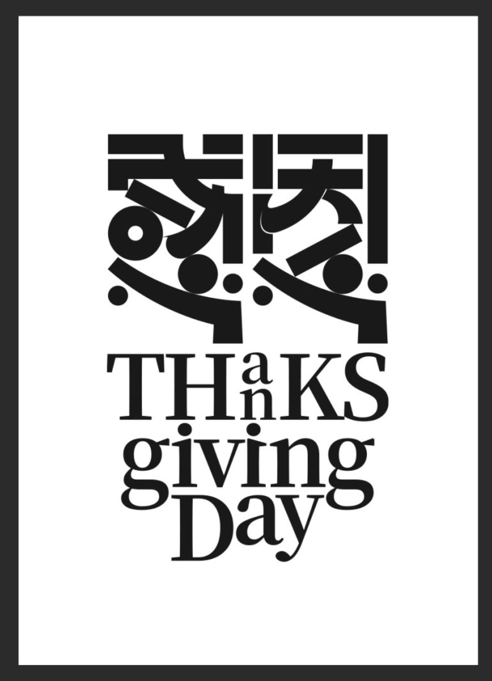 设计前先明确文字的 “核心气质”:“感恩节” 需要传递 “温暖、感恩、西方属性”,由此拆解出关键词:西方(几何化视觉)、第 4 个星期四(数字 4 为灵感)、感恩于心(内柔外刚)。基于这些关键词,确定设计规则:笔画粗细用 40px(4×10),“口”“点” 用圆形替换,“心” 字旁做弧形处理,让每个设计决策都有 “主题依据”。