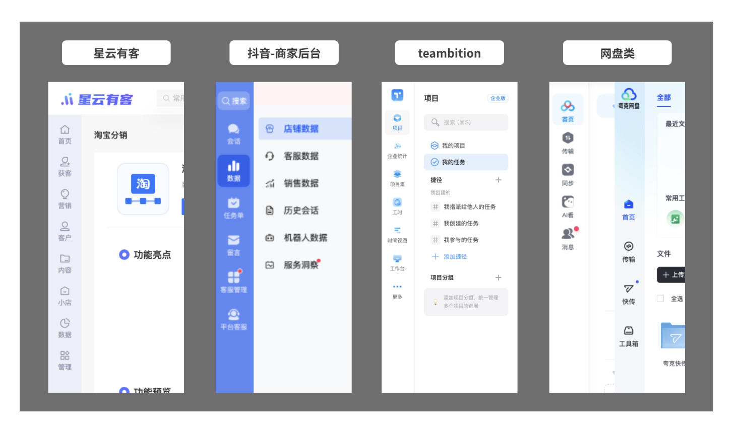 - 细栏(垂直导航):以图标为核心,文字辅助说明,适用于模块较少、需最大化展示内容区域的场景,如网盘类产品、轻量型工具后台。优势是简洁高效,能减少导航对核心工作区的占用,但要求用户对图标含义有较高认知度,典型案例包括夸克网盘、Teambition 企业版。