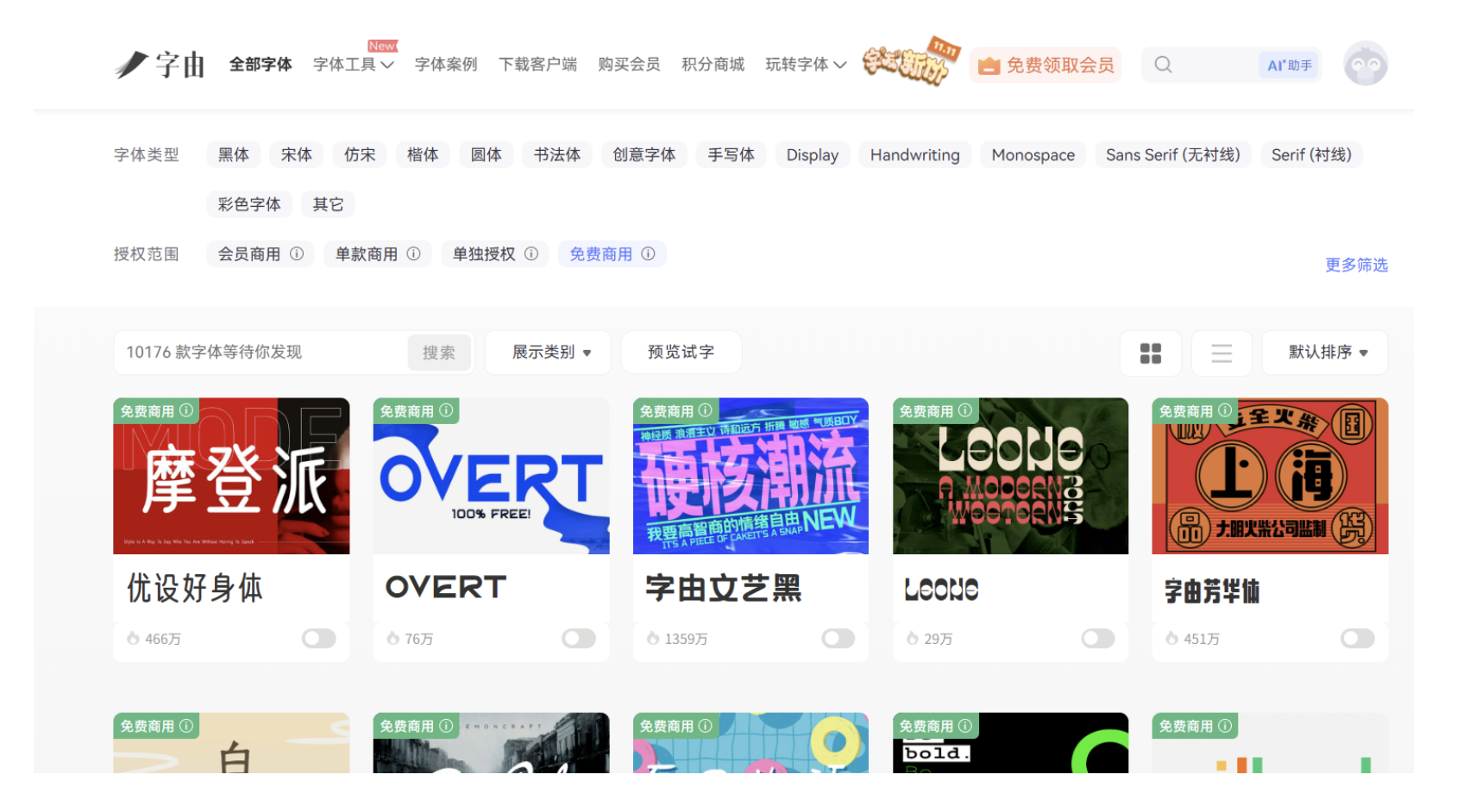 专注于中文字体的猫啃网,是个人设计师和小型工作室的福音。平台已搜集 758 款免费商用中文字体,更新频率高,经常能挖到新发布的优质字体,冷门小众款也能在这里找到。