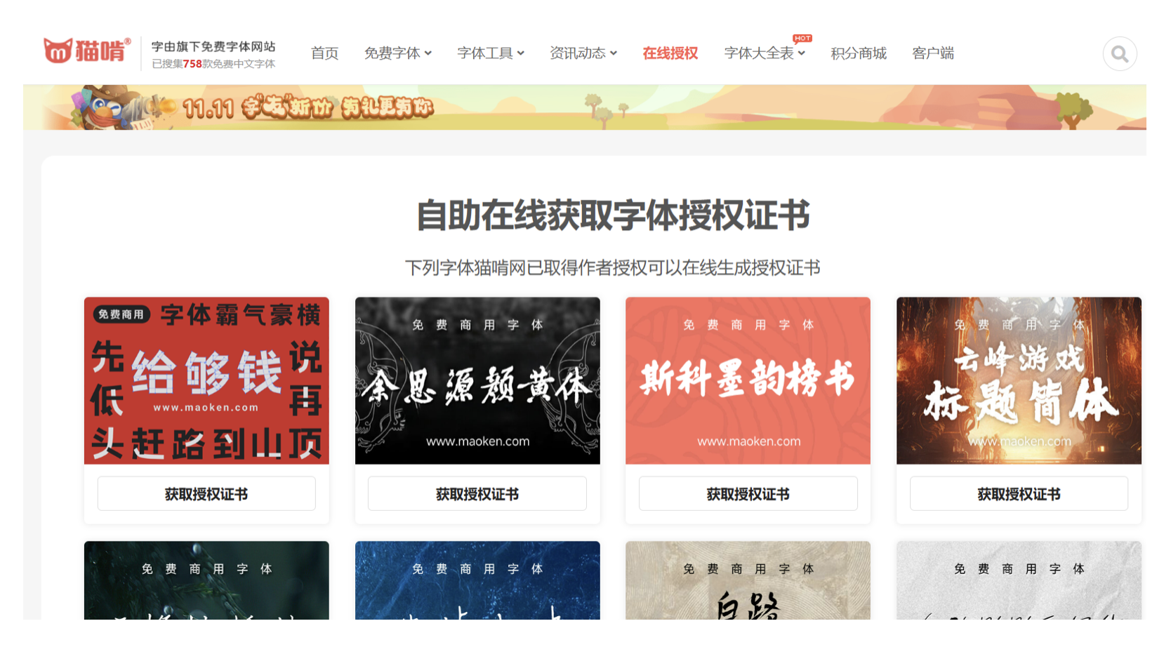 网站界面简洁,字体分类清晰,每款字体都明确标注授权信息,可直接下载本地使用,也能关联字由客户端一键应用。更贴心的是,部分热门字体支持在线开具授权证书,面对客户的版权审核需求时能直接拿出证明,预算有限又追求设计质感的话,这里绝对值得深挖。