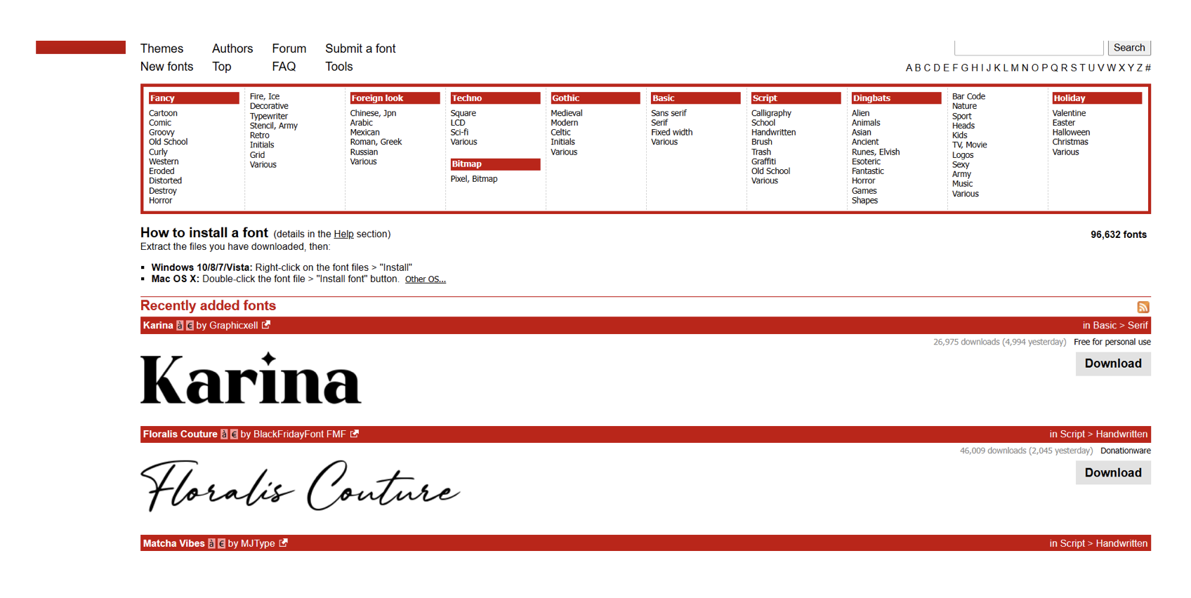 Dafont 是老牌免费字体网站,收录超 4 万款字体,风格从经典到怪异应有尽有,以英文字体为主,也不乏设计师自制的创意中文字体。它的分类系统格外细致,可按主题、风格、用途筛选,节日海报、游戏界面等特殊场景的字体需求,在这里都能找到惊喜。