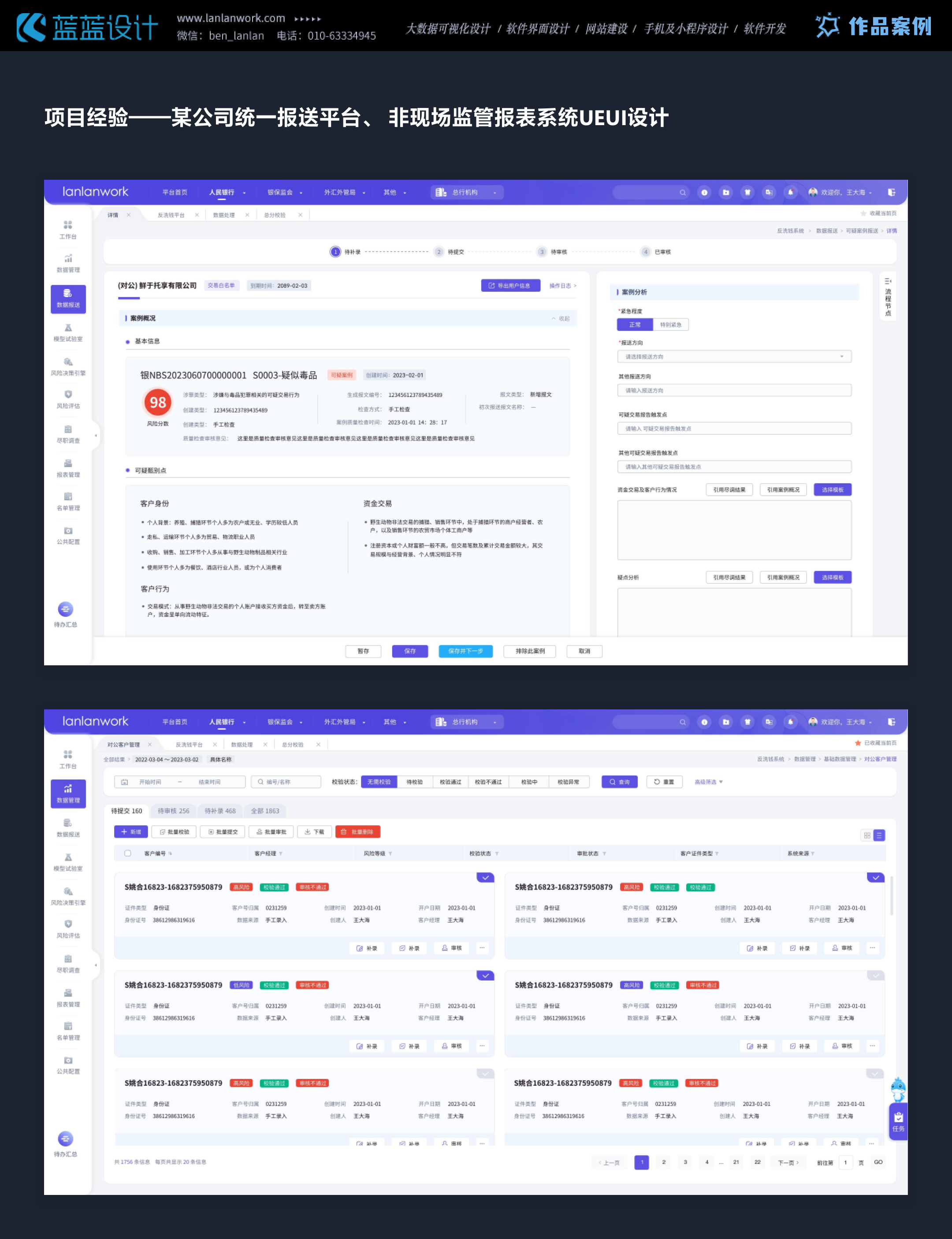 作为企业级监管系统的设计案例,蓝蓝设计的本次实践证明:专业场景下的系统设计,不是 “功能的堆砌”,而是基于工作流程的体验重构—— 通过界面布局、交互逻辑的优化,让复杂的合规工作变得 “高效、清晰、可控”。