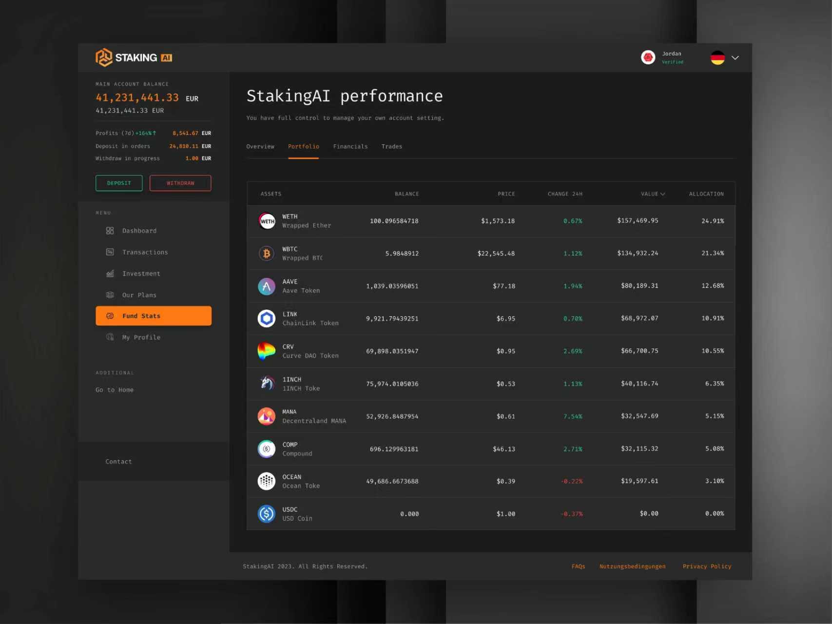 当加密资产管理界面还在 “炫彩特效” 与 “数据过载” 中摇摆时,StakingAI 的界面设计以暗黑基底 + 高对比信息层,构建了加密金融场景下 “理性、精准、高效” 的视觉语言。这不仅是一个资产看板,更是加密投资者 “掌控风险与收益” 的数字操作台。