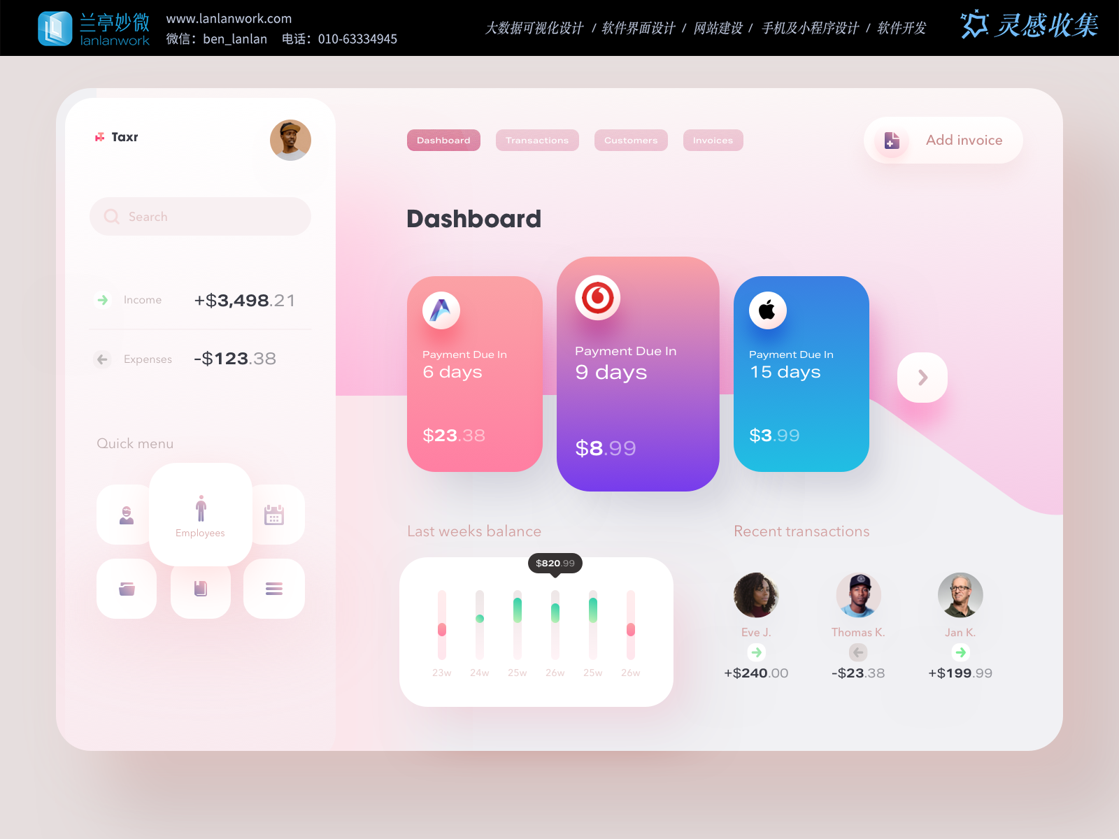 财务工具常陷入 “深蓝黑灰 + 严肃排版” 的刻板印象,而 Taxr 选择低饱和粉紫渐变 + 柔白基底的视觉体系,重新定义了财务界面的情绪基调:主色调以 “粉 - 紫 - 蓝” 的渐变色块区分核心财务模块,既通过色彩编码让 “待收账款” 的优先级(粉色 > 紫色 > 蓝色)直观可感,又以柔和的色调消解了财务数据的 “压迫感”—— 色彩心理学中,粉色关联 “关注”、紫色关联 “提醒”、蓝色关联 “常规”,恰好匹配不同账期的管理需求。