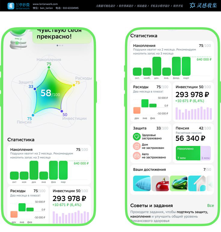 行动引导层:底部的 “Советы и задания”(建议与任务)模块,将 “提升保险、增加储蓄” 等理财目标转化为 “可执行的小任务”,搭配 “你的成就” 可视化激励,让用户从 “被动看数据” 转向 “主动做改善”,契合俄语区用户偏好 “明确指令 + 即时反馈” 的交互习惯。
