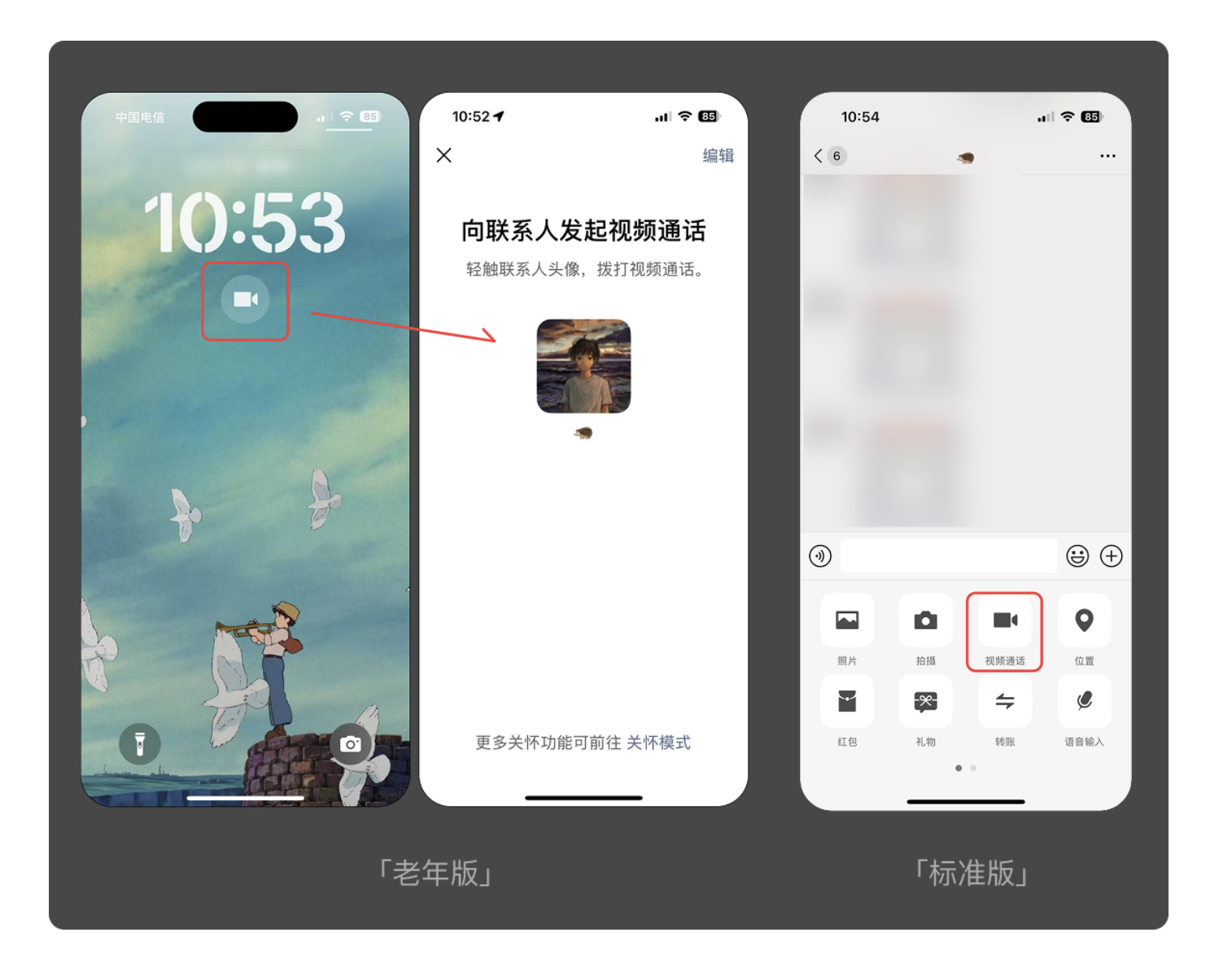 这种设计思路的核心,是 “减法思维”—— 筛选出老年用户最常用的功能,将其置于最显眼的位置,去除所有干扰项,让操作路径最短化。