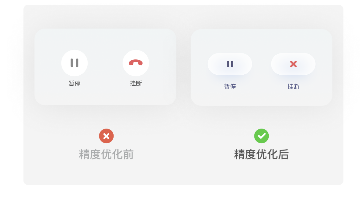 - 元素统一:检查按钮图标风格,避免线性图标(如暂停的双竖线)与面性图标(如挂断的电话图形)混用。统一采用线性图标,确保线条粗细一致,让视觉风格更统一。