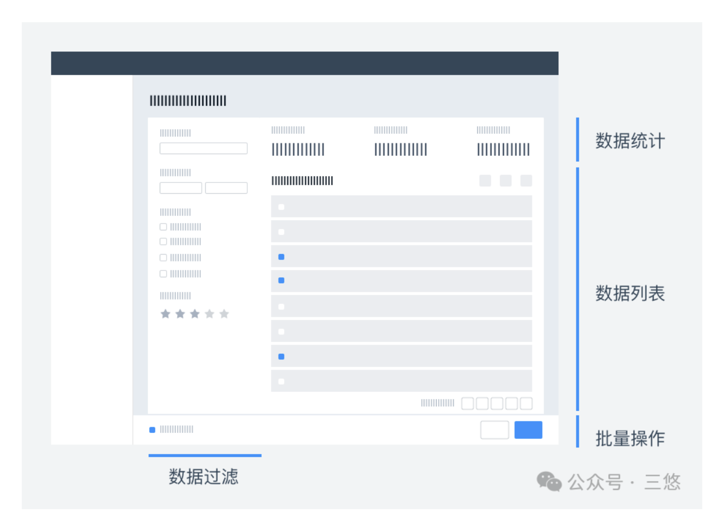 双栏布局将数据过滤模块单独置于左侧侧栏,右侧展示数据统计与数据列表,适合过滤条件较多的场景,既能保留完整的筛选功能,又不影响数据展示区域的完整性。