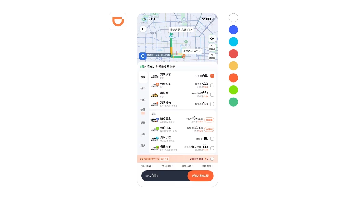 滴滴国内版则采用 “高饱和度、多色彩分区” 策略:橙色代表主叫车业务、绿色代表拼车、蓝色代表巴士服务,同时用红色标注拥堵路况、绿色标注畅通路况。通过强烈的色彩对比明确功能边界,吸引用户注意力,贴合国内用户对 “明确区分” 与 “热闹感” 的视觉偏好,营造出活力满满的产品氛围。