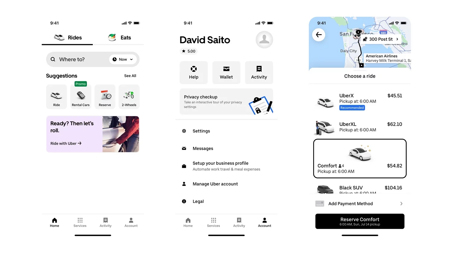 页面无冗余营销广告,功能模块与信息层级区分清晰,减少用户无意义操作,专注于为用户提供简洁高效的叫车服务。这一设计逻辑源于成熟的海外市场环境:用户对 APP 的使用目的明确(Uber = 叫车),无需通过附加功能吸引用户,优化核心流程、提升专业体验才是关键。