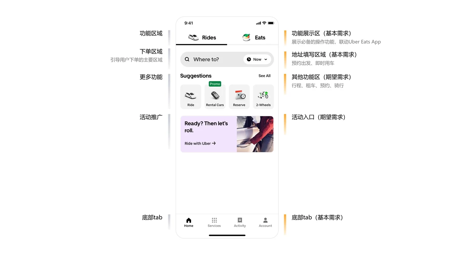 以 Uber 首页为例,可划分为功能展示区、地址填写区、下单区域、活动推广区与底部 tab 五大模块,功能分类框架清晰,优先级明确。核心区域聚焦叫车、预约出发、即时用车等基本需求,同时联动 Uber Eats App 拓展服务边界,其他功能(如租车、骑行)则作为辅助选项,不占用核心视觉空间。