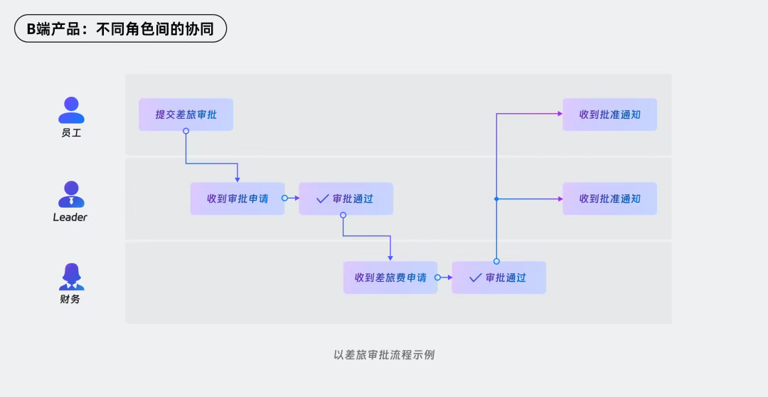 不同于C端产品,B端产品功能不仅限于个人使用,还涉及到不同角色间的协同行为和联动场景,例如企业内的人财物事,一个简单的差旅审批可能就涉及到三种不同角色间的工作协同。