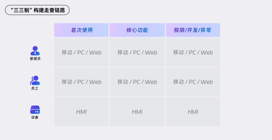 为了确保走查的全面覆盖且能抓住重点,我们采用“三三制”来制定具体的走查链路及任务。主要从三个维度进行定义: