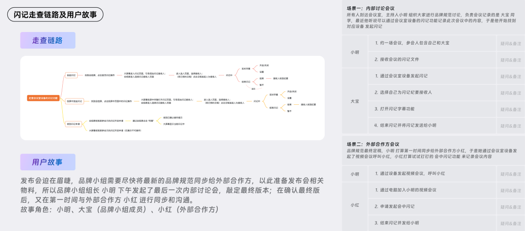 以下是根据“三三制”构建了关于“会议室闪记'功能走查链路以及最终的用户故事和任务卡。