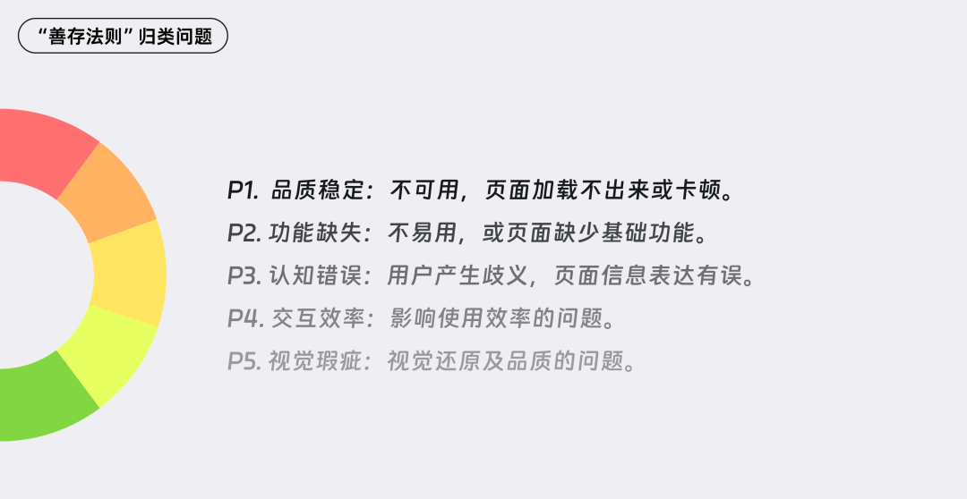 面对走查中产生的大量问题,如何合理划分优先级至关重要。我们引入了一套名为“善存法则”的分类标准,具体如下: