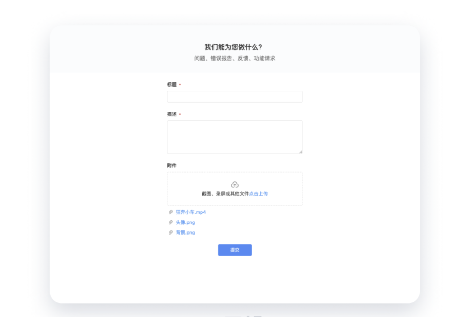 示例场景:简单的错误报告表单,仅包含 "问题标题"" 描述 ""附件" 三个字段,采用单列布局让用户快速完成提交。
