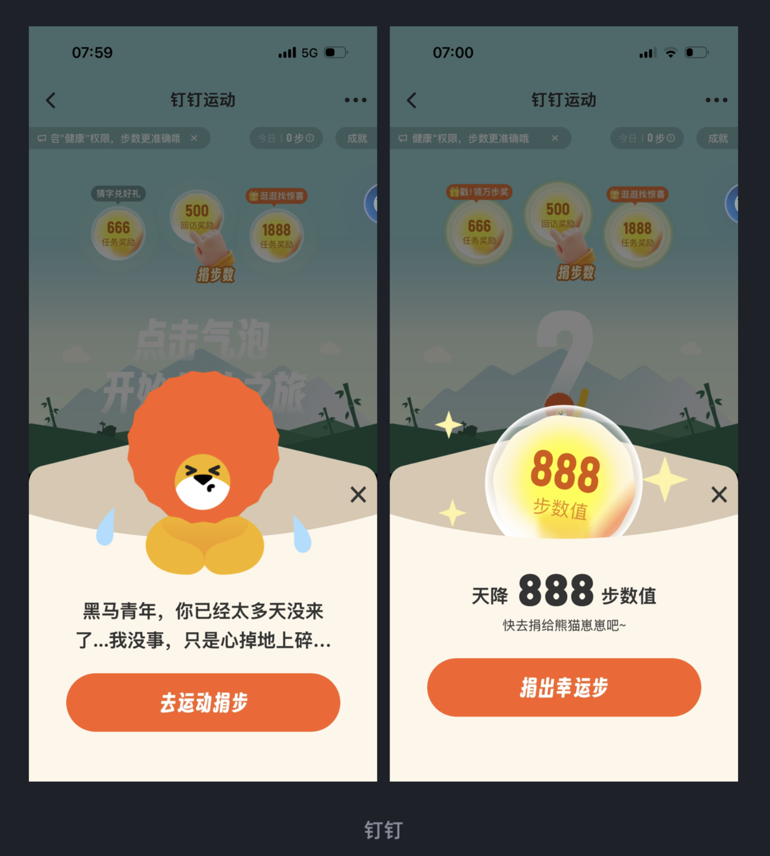 钉钉运动为了激活沉寂用户参与捐步,采用了极具感染力的文案沟通方式。面对长时间未登录的用户,文案以 “黑马青年,你已经太多天没来 了... 我没事,只是心掉地上碎...” 的拟人化表达传递失落感,同时结合 “天降幸运步” 的福利机制,让用户在情感共鸣与幸运心理的双重驱动下,主动参与捐步。这种设计跳出了功能型文案的框架,用情感连接用户,让产品更具人情味。