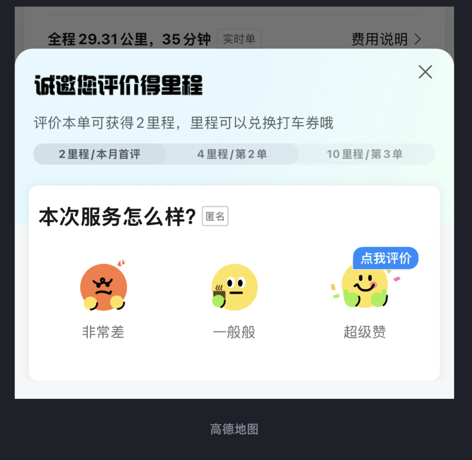 高德地图在打车服务结束后,设计了多维度的反馈场景。不仅会询问 “车内空气是否清新” 等具体服务细节,还推出 “评价得里程” 的激励机制 —— 用户评价后可获得里程,进而兑换打车券。这种设计一方面能帮助平台收集真实反馈,推动司机服务优化;另一方面让用户意识到自己的意见能直接影响后续服务质量,同时获得实际福利,从而更愿意主动参与反馈,形成良性循环。