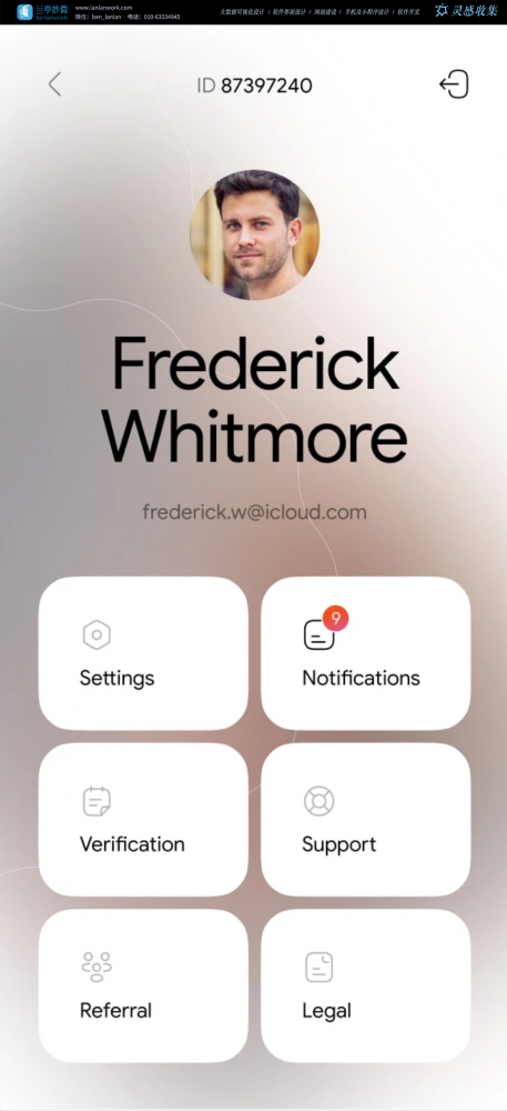 - 极简布局,顶部展示头像、姓名与邮箱,下方功能入口采用大圆角卡片设计,视觉轻盈且易于点击。