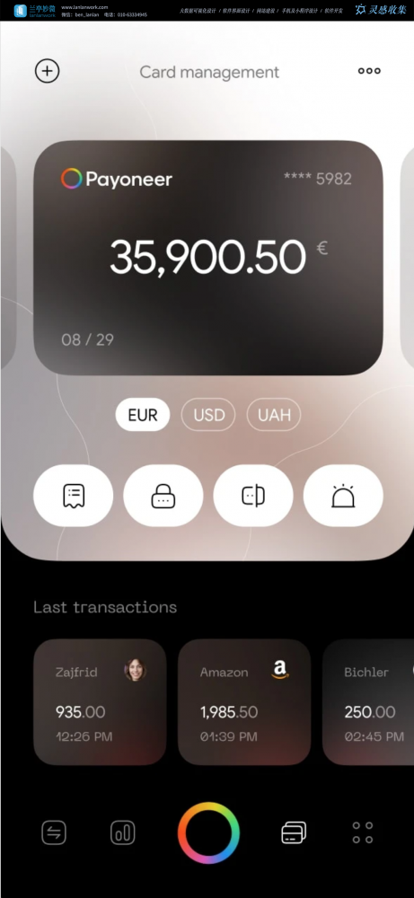 - 深色磨砂质感的卡片设计,突出显示余额 “35,900.50 €”,搭配三色切换标签(EUR/USD/UAH),让多币种管理一目了然。