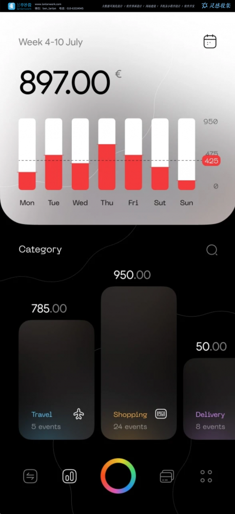 - 下方的分类支出卡片(Travel/Shopping/Delivery)用不同渐变色调区分类别,提升信息识别效率。