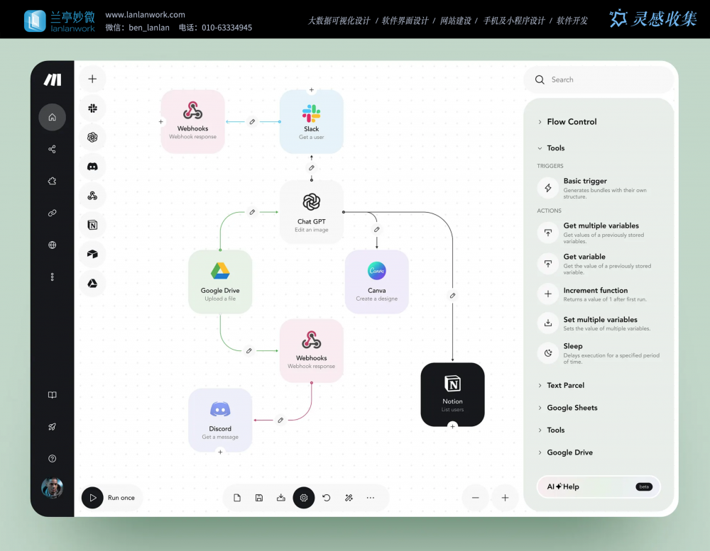 - 核心功能:拖拽式的节点设计,用不同颜色的线条和箭头区分数据流向,右侧工具列表可快速添加触发条件与动作,适合非技术人员快速搭建自动化场景。