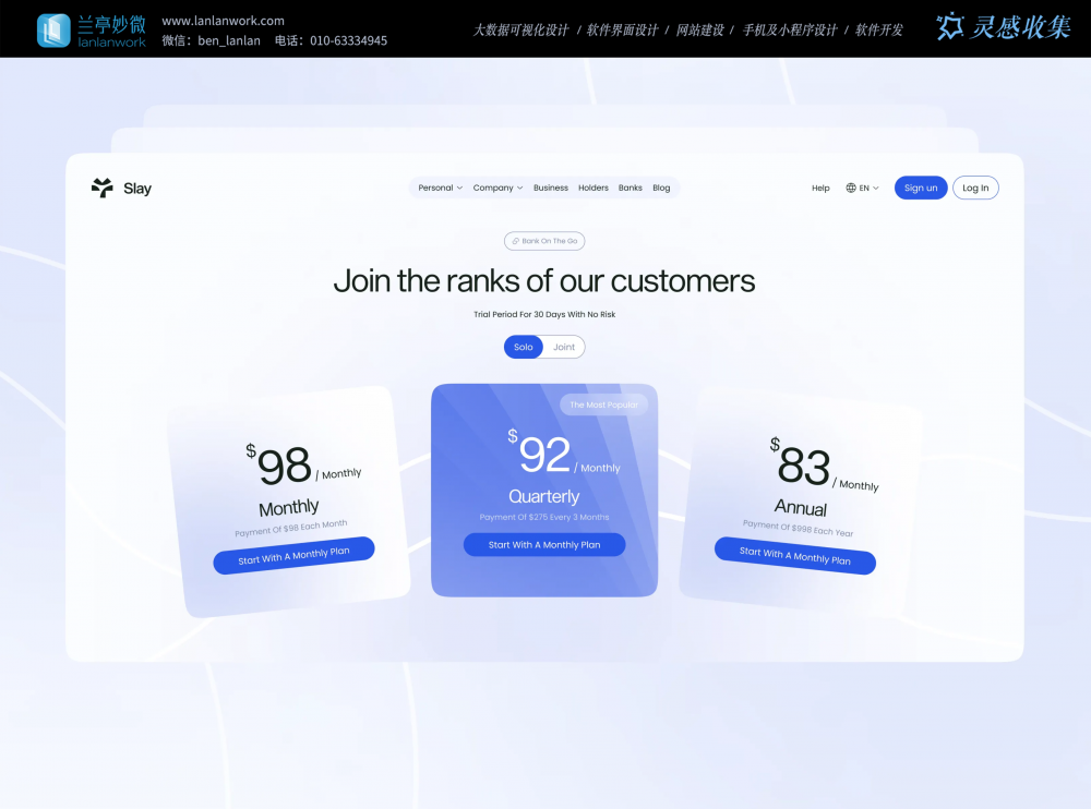 - 核心功能:三个套餐卡片以不同透明度和色彩区分主次,中间 “最受欢迎” 的季度套餐用高饱和蓝色强化视觉焦点,顶部的切换按钮可快速切换个人 / 企业方案。