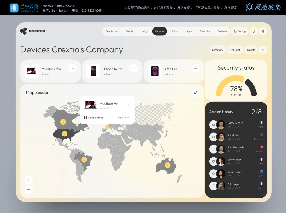 - 核心功能:全球设备分布地图以深浅灰度区分区域,黄色标记设备数量,悬浮卡片可快速查看设备详情;右侧安全状态仪表盘与历史会话列表,让管理员对设备风险和使用记录一目了然。